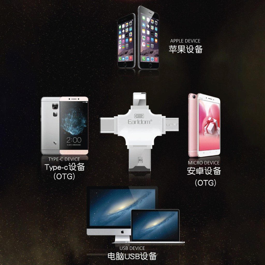 Đầu đọc thẻ nhớ OTG 4in1 cho iOS/Android/PC- Macbook Type C Earldom ET-OT20 - Hỗ trợ iOS 12 mới nhất