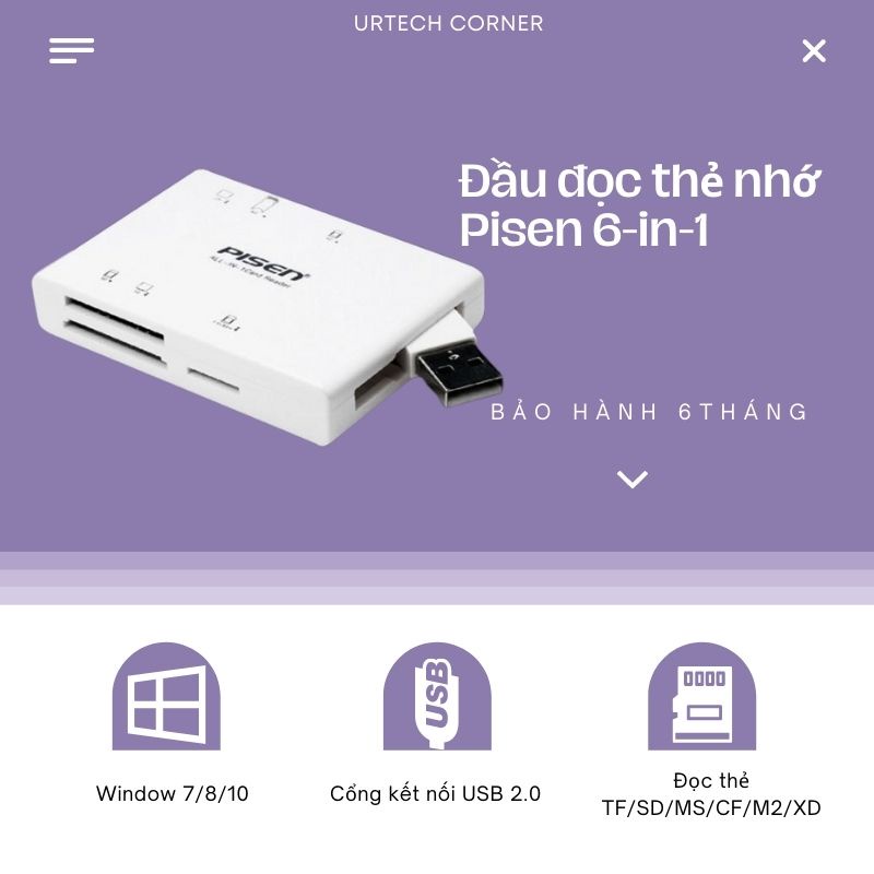 Máy tính & Laptop > Phụ Kiện Máy Tính > Bộ chia cổng USB & Đọc thẻ nhớ || Đầu đọc thẻ nhớ Pisen Urtechconer sử dụng cho các loại thẻ TF/SD/MS/XD/M2 cổng cắm USB 2.0 kết nối dễ dàng với máy tínhCòn hàng