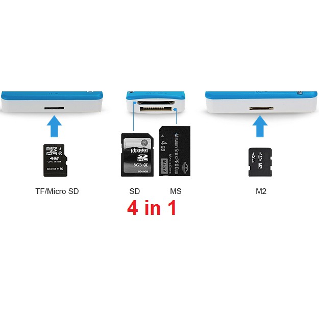 + Loại 4 in 1 đọc 4 loại thẻ: ①SD/SDHC/MMC; ②MS/MS DUO/MS Pro; ③Micro SD/Micro SDHC;④M2