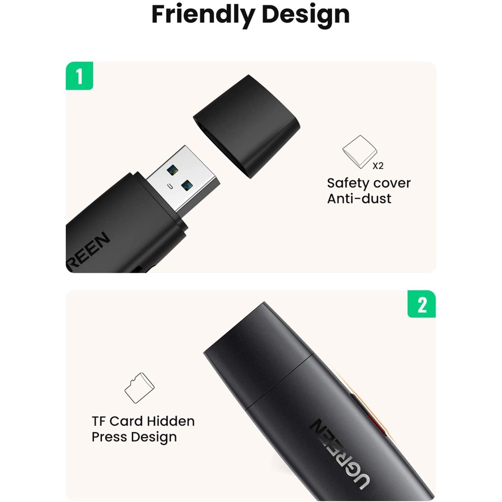 Tính năng với khe cắm thẻ kép SD và TF (Micro SD), Ugreen 80191 hỗ trợ đọc và ghi 2 thẻ đồng thời. Nó tương thích với thẻ nhớ trên Máy quay phim, DashCam, Máy ảnh thể thao, Máy ảnh DSLR, Màn hình, Máy bay không người lái, Máy ảnh kỹ thuật số, có thể truy cập vào lightroom hoặc phát lại video trực tiếp trên điện thoại / máy tính bảng của bạn.