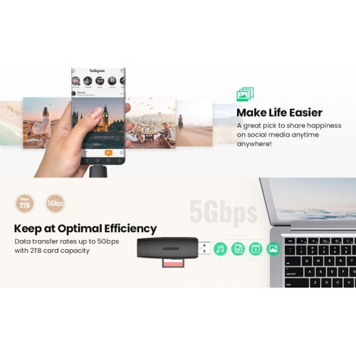 Đầu đọc thẻ SD/TF nhỏ gọn Ugreen 80191 này dễ dàng truyền / sao chép / phát lại ảnh du lịch của bạn sang điện thoại hoặc máy tính bảng hỗ trợ USB-C OTG, chia sẻ ảnh của bạn trên Facebook hoặc các phương tiện truyền thông xã hội khác ngay lập tức.