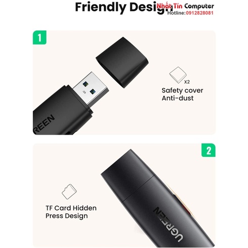 Tính năng với khe cắm thẻ kép SD và TF (Micro SD), Ugreen 80191 hỗ trợ đọc và ghi 2 thẻ đồng thời. Nó tương thích với thẻ nhớ trên Máy quay phim, DashCam, Máy ảnh thể thao, Máy ảnh DSLR, Màn hình, Máy bay không người lái, Máy ảnh kỹ thuật số, có thể truy cập vào lightroom hoặc phát lại video trực tiếp trên điện thoại / máy tính bảng của bạn.