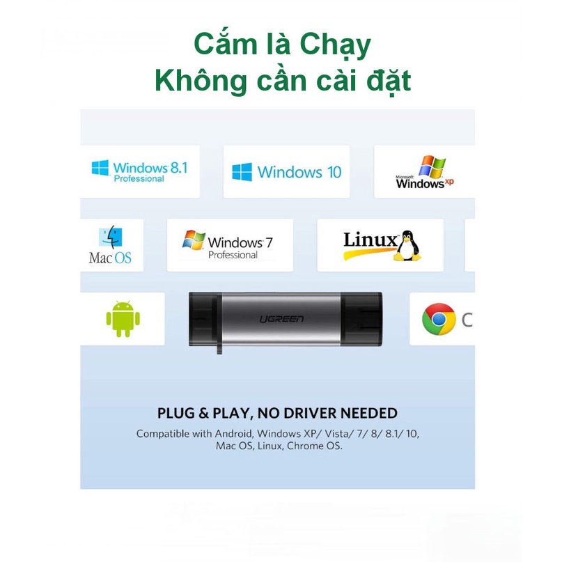 Đầu đọc thẻ nhớ USB 3.0 Ugreen 50706 hỗ trợ: Windows XP, 7, 8, 10, Linux, Mac OS X…Ngoài ra bạn có thể sử dụng cho máy tính bảng, điện thoại Android