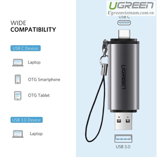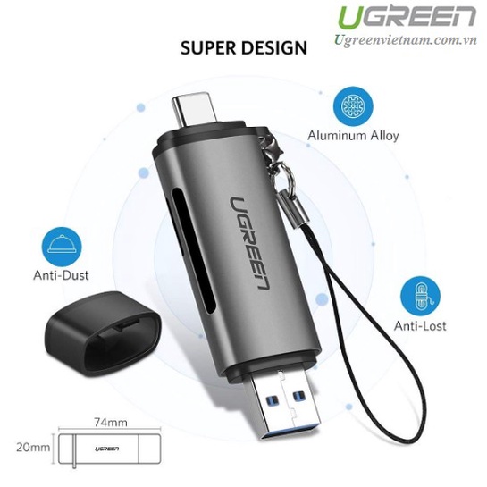 Đầu đọc thẻ nhớ SD/TF chuẩn USB Type C và USB 3.0 Ugreen 50706 cao cấp chính hãngĐầu đọc thẻ nhớ SD, TF Ugreen 50706 chính hãng. Thiết kế cực kỳ nhỏ gọn, và thời trang. Ugreen 50706 hỗ trợ 2 loại thẻ phổ biến hay dùng SD, TF.