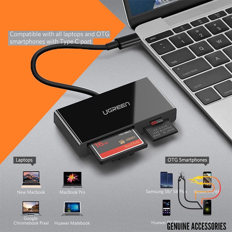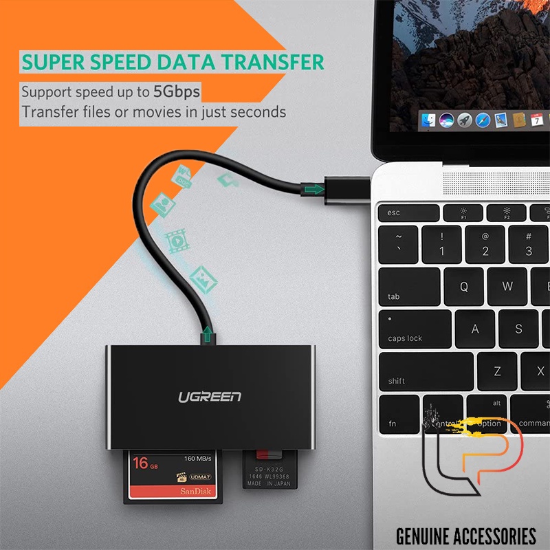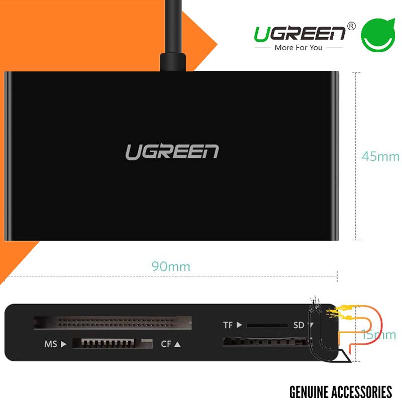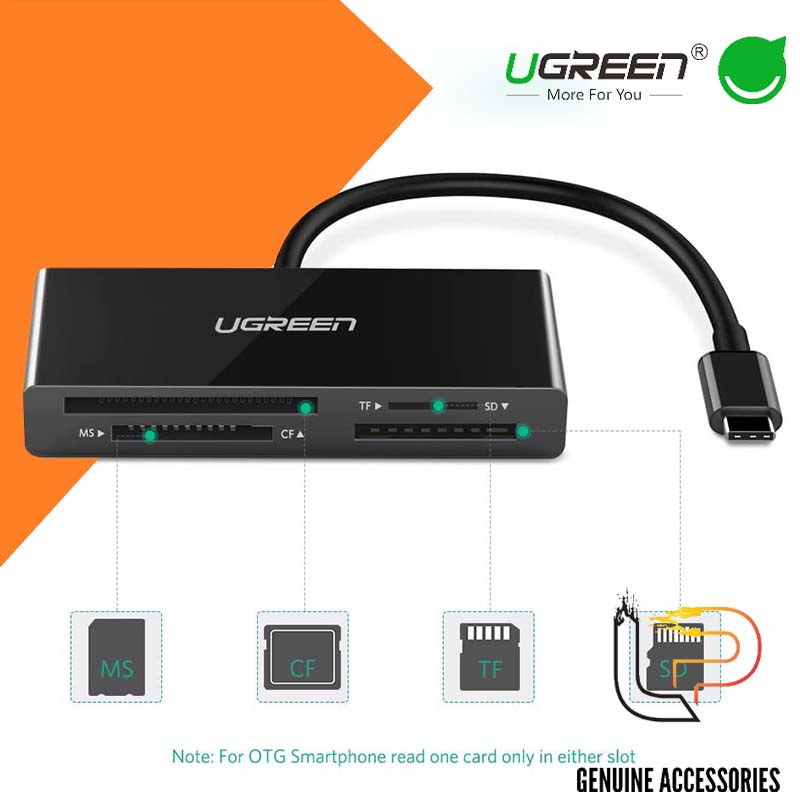 2. Ugreen 50443 được thiết kế với 4 khe cắm thẻ, đầu đọc thẻ nhớ này có thể đọc và truyền dữ liệu cho các loại thẻ Micro SD, SD, CF và MS 4. Không hỗ trợ Thẻ CF II.