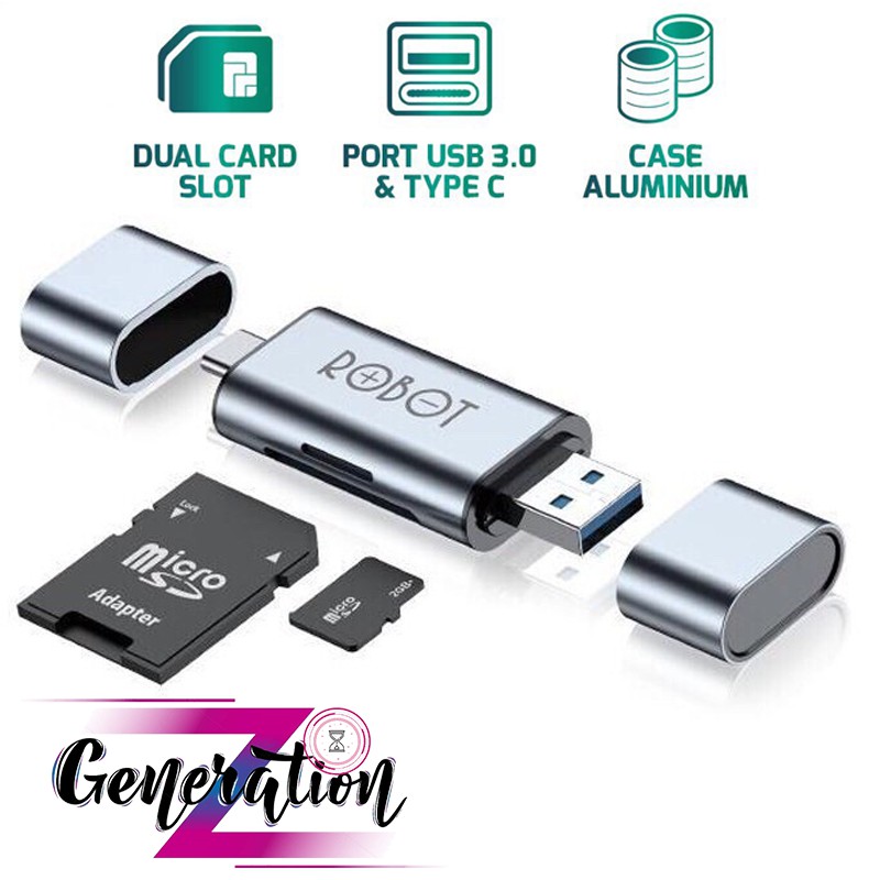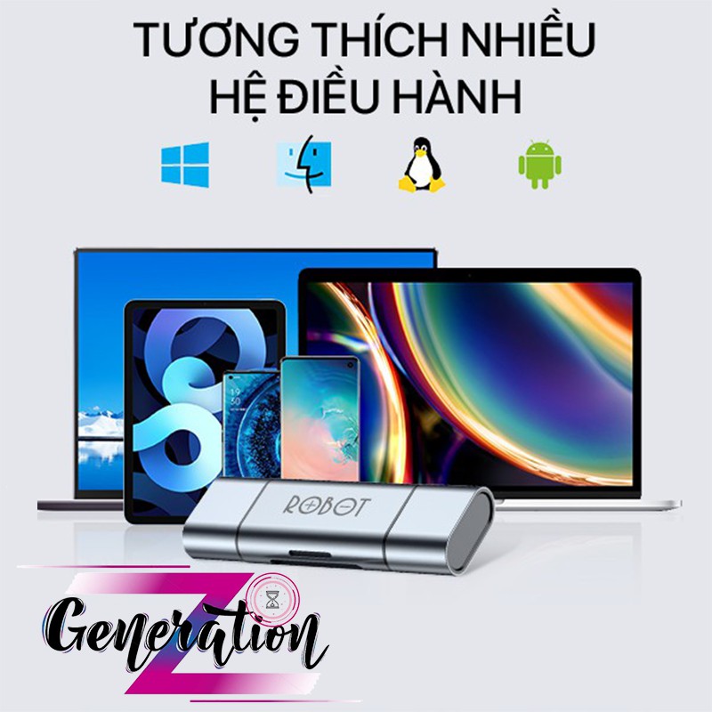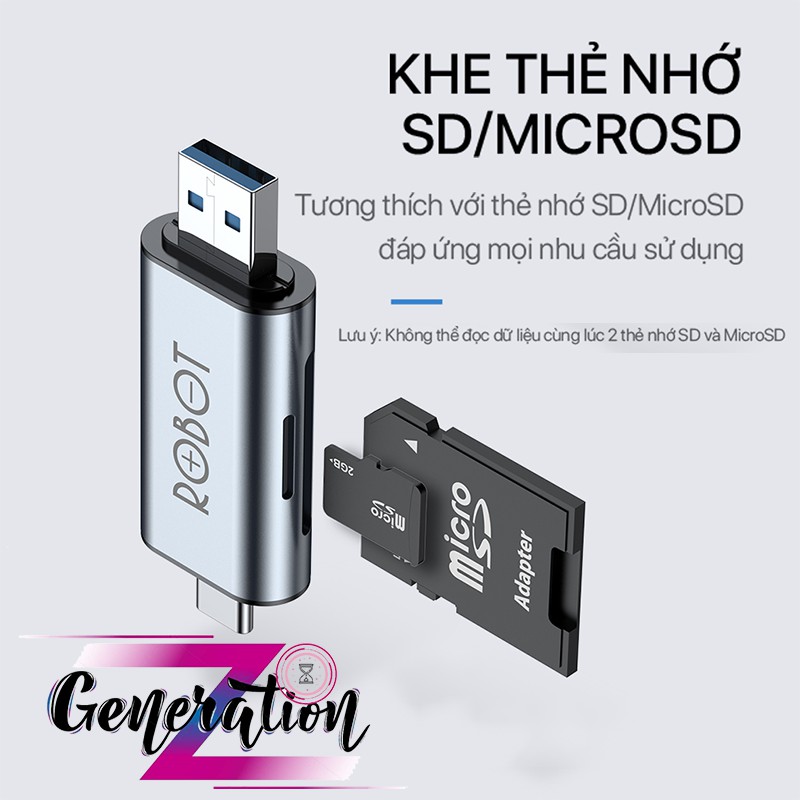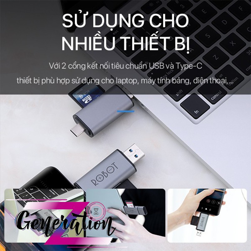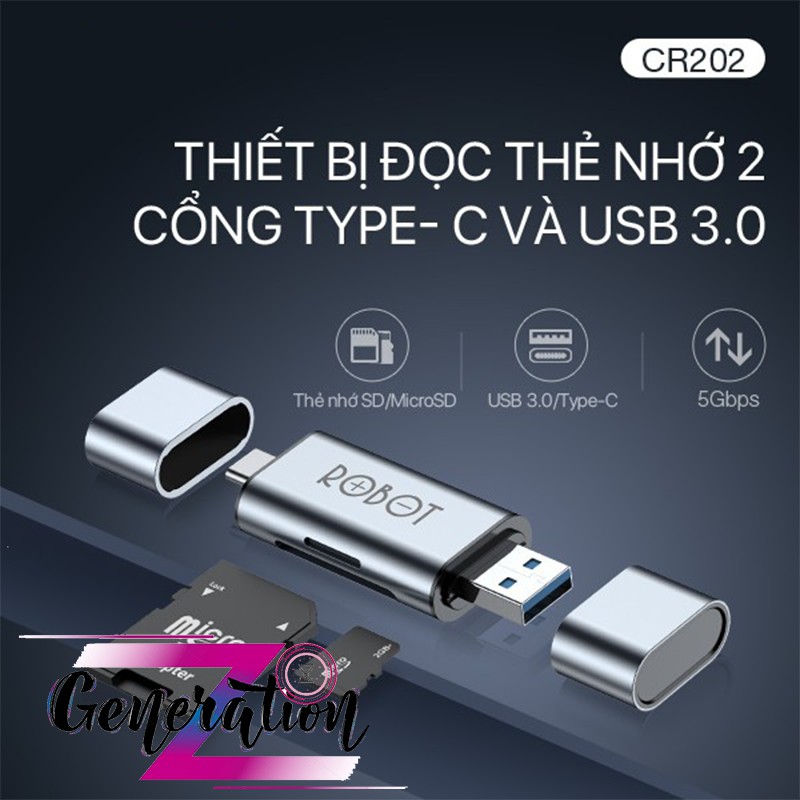 THIẾT BỊ ĐỌC THẺ NHỚ SD/ MICRO SD ROBOT CR202 - HAI ĐẦU TYPE-C VÀ USB 3.0- Thiết bị có khe cắm thẻ nhớ hỗ trợ các định dạng thẻ :