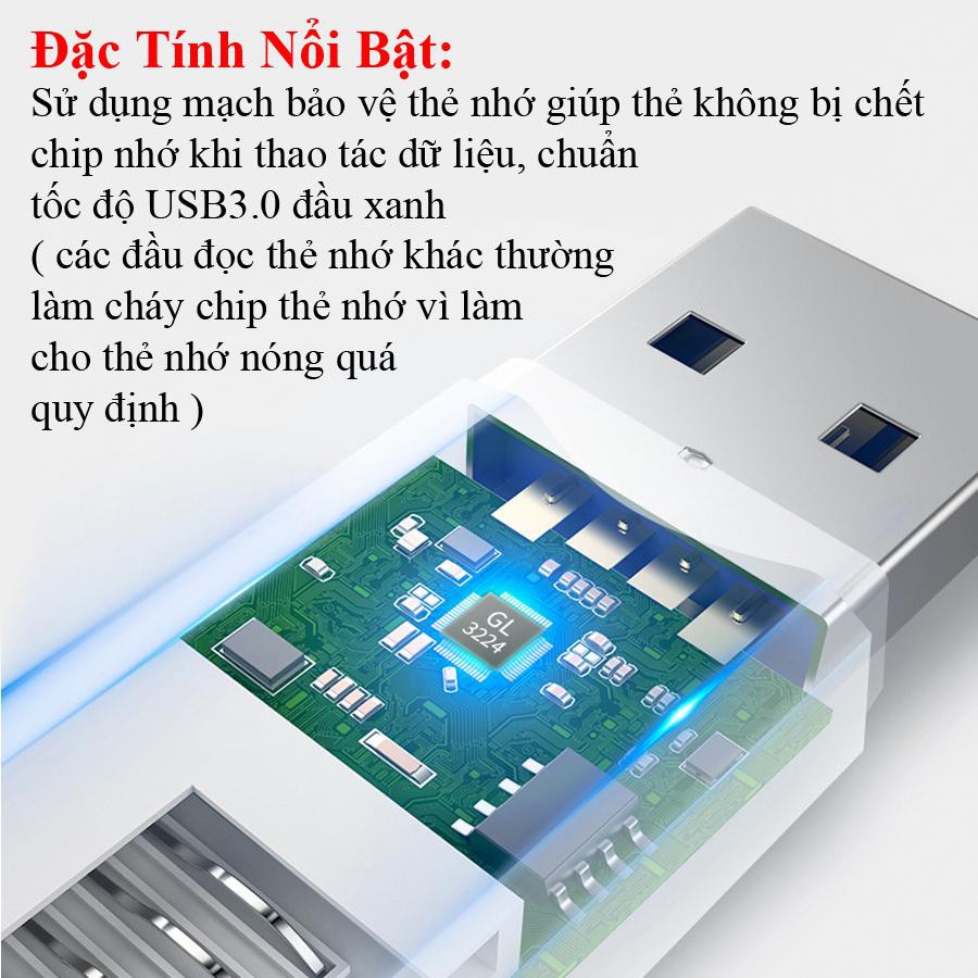 Tính năng nổi bật: đầu đọc thẻ sử dụng mạch chip GL3224 bảo vệ thẻ nhớ tiền triệu của bạn khỏi bị cháy chíp nhớ vì không làm cho thẻ nhớ nóng quá tải, bảo vệ luồng dữ liệu khi thao tác, đây là sự khác biệt giữa các đầu đọc thẻ loại thường.