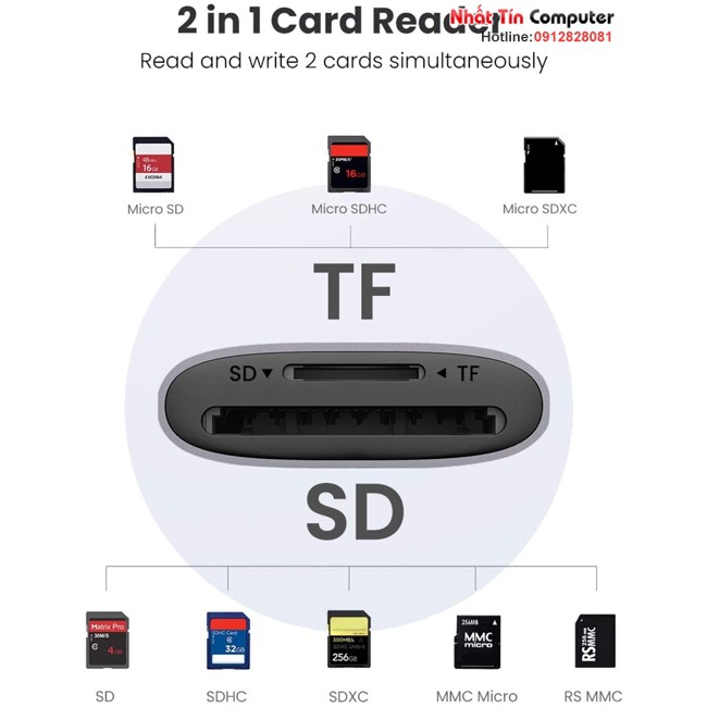 Đầu đọc thẻ khe cắm kép: Bộ chuyển đổi thẻ nhớ USBUgreen sang SD 2 trong 1 mang đến cho bạn sự linh hoạt và tiện lợi khi truy cập nhiều loại thẻ nhớ. Với việc hỗ trợ đọc và ghi đồng thời 2 thẻ, bạn có thể dễ dàng xem lại tệp hoặc sao lưu và lưu trữ ảnh và video trong thẻ UHS-I SD, SDHC, SDXC, MICRO SD, MICRO SDHC, MICRO SDXC. Hơn nữa, nó hỗ trợ thẻ UHS-II SD/TF, nhưng tốc độ sẽ là UHS-I.