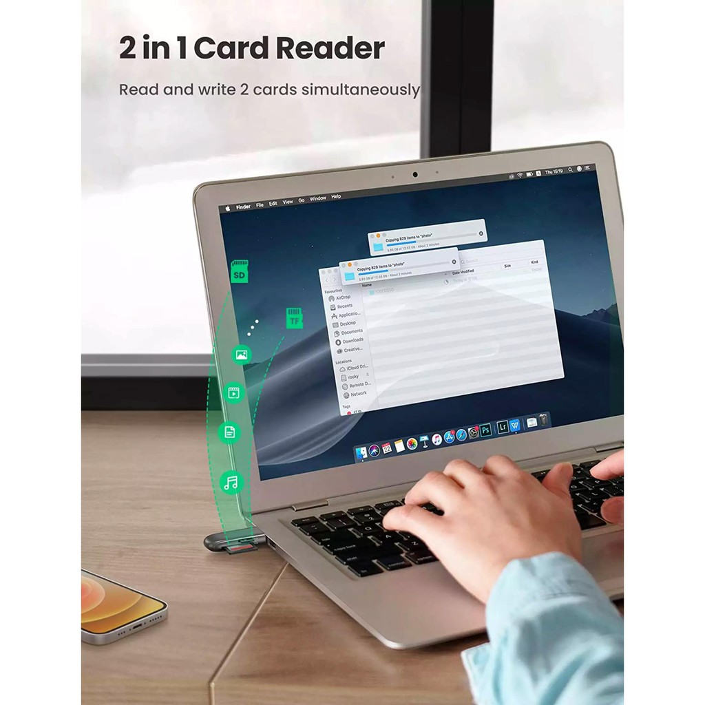 Cho phép bạn kết nối trực tiếp thẻ SD hoặc Micro SD với máy tính, cung cấp một phương pháp tiện lợi và nhanh chóng để truy cập ảnh, phim, tệp từ thẻ nhớ của bạn. Nó cho phép bạn đọc và ghi 2 thẻ đồng thời, cũng có thể truyền tệp trực tiếp giữa 2 thẻ, một lựa chọn tuyệt vời để tiết kiệm nhiều thời gian và giải quyết rắc rối khi chuyển ảnh, tệp và phim vào máy tính