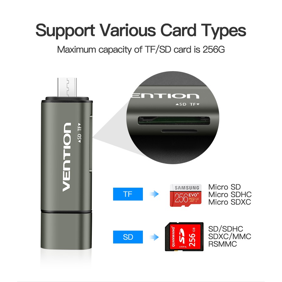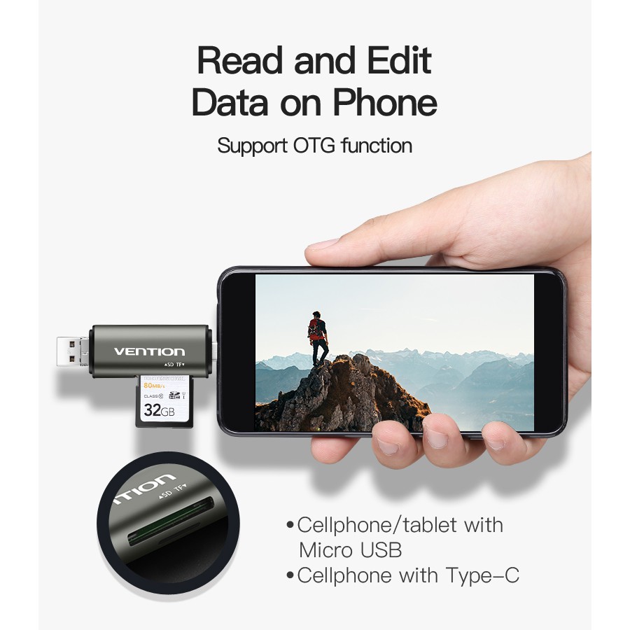 Máy tính & Laptop > Thiết Bị Lưu Trữ > USB & OTG || Đầu đọc thẻ USB 3.0 Vention đa năng ( Type C, Micro USB, SD, TF) dùng cho điện thoại và máy tínhCòn hàng