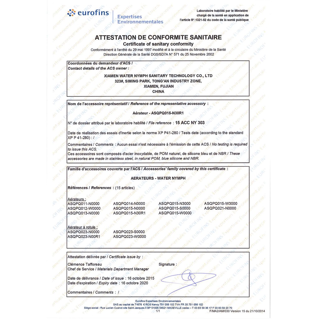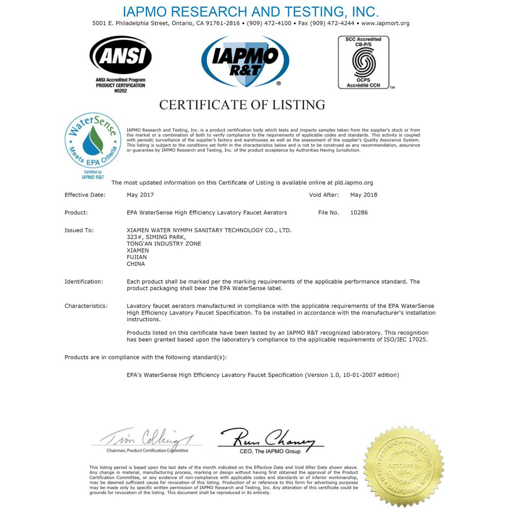 Tiêu chuẩn chất lượng/kỹ thuật: NSF Listing - WHO, CUPC Listing, WaterSense, 15 ACC NY 303 (Eurofins), WM-022684 Certificate