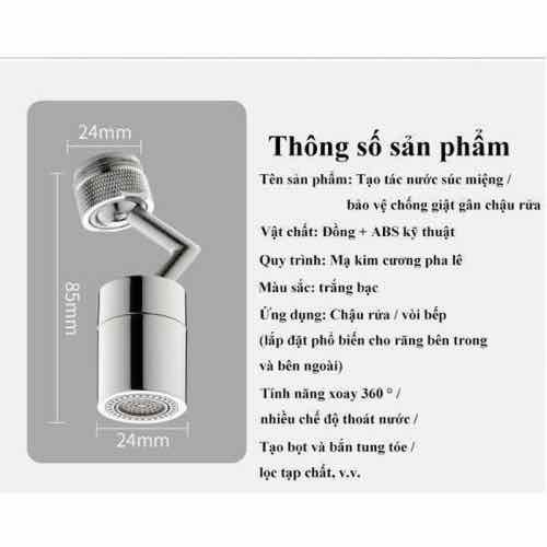 Đầu nối vòi nước tăng áp xoay 720 độ lắp vòi nước chậu rửa bát với 2 chế độ nước chảyKích thước 85 x 24 x 24mm
