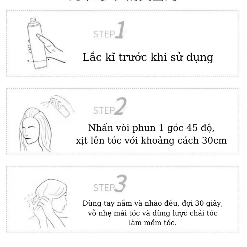 Lắc trước khi dùng- xịt cách vị trí cần xịt tóc khoảng 20cm