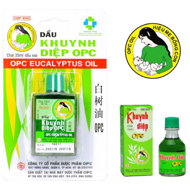 Dầu Khuynh Diệp OPC nhãn hiệu Mẹ Bồng Con là sản phẩm dầu xoa được bào chế từ các loại tinh dầu thiên nhiên và nguyên liệu.Với màu xanh lá cây, mùi thơm đặc trưng, dầu Khuynh Diệp OPC có tác dụng đối với một số bệnh thông thường.Công thức :