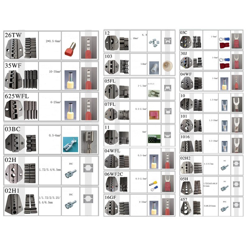 Đây là danh sách đầu kìm bấm cos, gồm 23 loai đầu cos khác nhau, mỗi đầu cos giá 120k, đầu cos này phù hợp cho loại kìm cos 9 inch, (tổng chiều dài kìm cos khoảng 230mm)Quý khách vui lòng xem kỹ thông số và ký hiệu của từn đầu cos, ghi chú rõ trên đơn hàng loại đầu cos cần mua, để shop lấy đúng loại. Trong trường hợp không ghi chú, shop sẽ giao ngẩu nhiên cho shop.