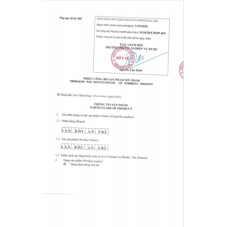 Sản xuất tại: CÔNG TY TNHH CÔNG NGHỆ SINH HỌC DƯỢC MỸ PHẨM SJK