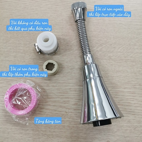 - Đối với vòi không muốn tháo đầu tạo bọt, hoặc không có ren nối ( như vòi hồ, vòi xả lạnh), hoặc vòi sử dụng lâu ngày khó vặn đầu tạo bọt thì có thể gắn thông qua phụ kiện nối đi kèm.