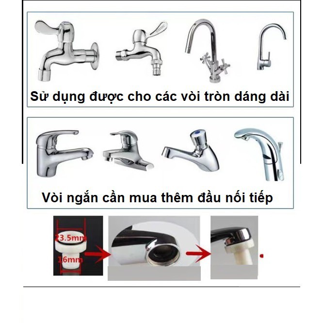 - Đầu lọc nước tại vòi có co tăng giảm giúp vừa cho mọi loại vòi tròn, cổ dài .(đường kính 15-32mm) Đối với các loại cổ ngắn, đầu vòi vuông, quý khách xin mua thêm cút nối chuyển đổi ở tiệm điện nước.