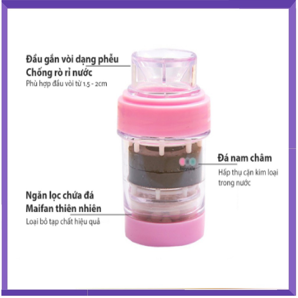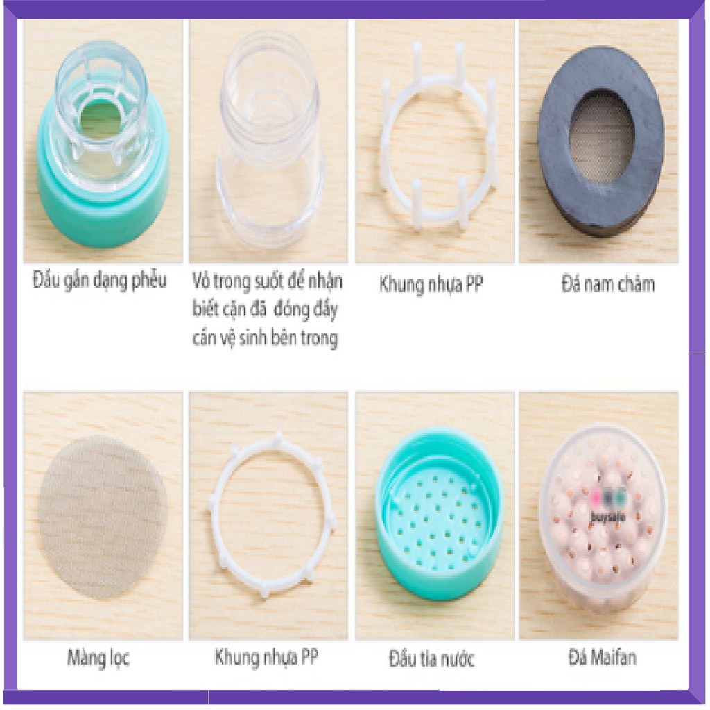 - Đầu lọc nước có 2 ngăn lọc: nam châm có tác dụng hút ion kim loại sinh ra từ gỉ của đường ống dẫn nước và đá maifan(một loại đá dùng trong y tế) loại bỏ tạp chất