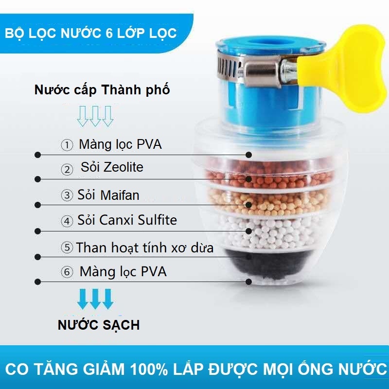 Sản phẩm của Shop là loại Đầu lọc nước trực tiếp thế hệ Mới nhất ( V4 ) dùng để lắp trực tiếp tại vòi , lõi lọc gồm 6 tầng lọc :