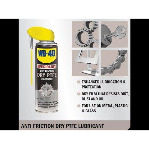 🌿Dầu nhờn khô, tác dụng cao WD-40 Specialist High Performance Dry Lube (360ml) Chứa PTFE (polytetrafluoroethylene) nhằm tăng cường chất bôi trơn và bảo vệ, để lại một lớp màng mỏng khô giúp bôi trơn, chống ẩm, chống bám bụi bẩn và dầu.