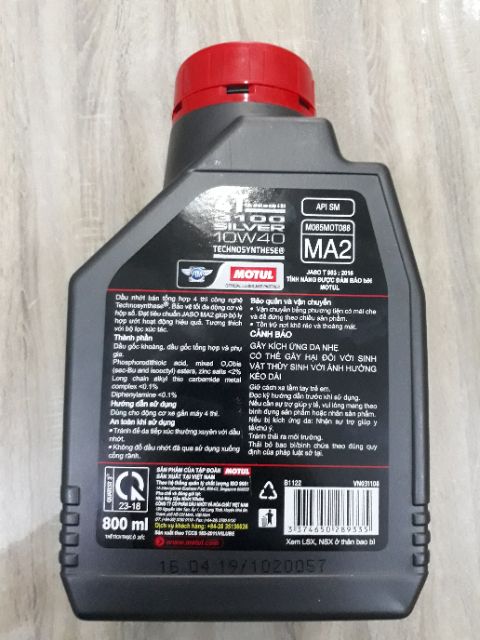 Dầu bán tổng hợp,đóng gói tại Việt Nam theo tiêu chuẩn Pháp,Motul Việt Nam phân phối chính hãng,API SM,JASO MA2,SAE 10W-40Phù hợp cho xe số và xe tay côn như Wave,Sirius,Future,Exicter,Winner,...