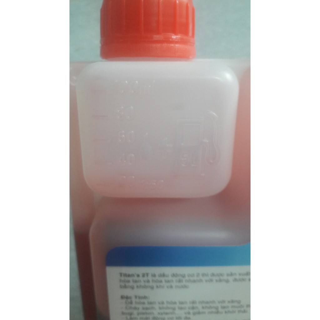 - Nhớt 2T TITAN là dòng nhớt được nhập khẩu từ Thái Lan và đóng chai tại Việt Nam. Nhớt được chứa trong chai 1L kiểu cách thiết kế 2 nắp riêng và 2 bầu riêng giúp bạn có thể dễ dàng pha với xăng đúng tỷ lệ nhất