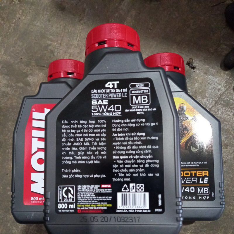 Dầu nhớt motul dùng cho xe tay ga 5w40 , 800ml tổng hợp 100%dầu nhớt tổng hợp 100% được thiết kế đặc biệt cho thế hệ xe tay ga 4 thì đời mới yêu cầu độ nhớt bôi trơn có cấp độ SAE 5W40 và tiêu chuẩn JASO MB giúp xe của bạn vận hành êm ái , tiết kiệm nhiên liệu , giảm khí thải , tính năng tẩy rửa và chống mài mòn