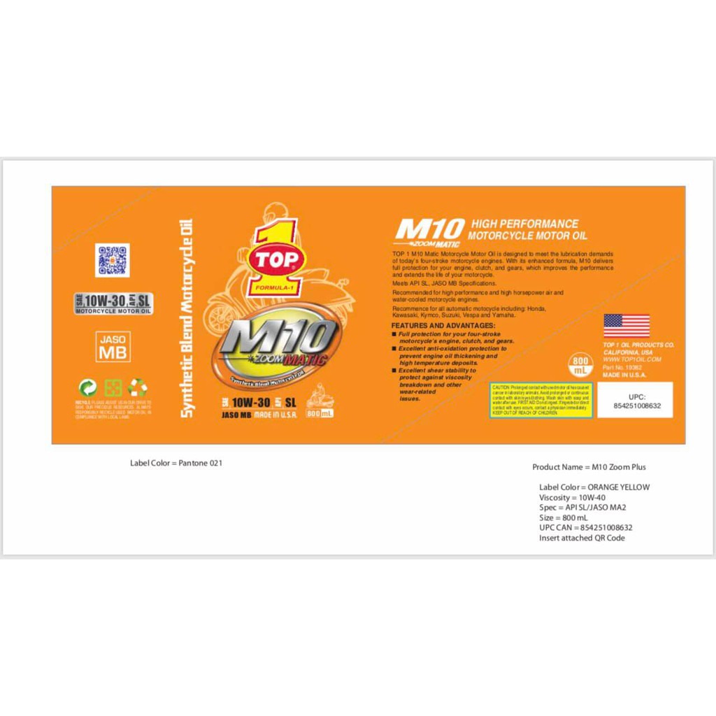 Nhớt Top 1 M10 Zoom Matic 10w30 là mẫu mới của Top 1 Matic 10w30, sản xuất và đóng gói tại nhà máy TOP 1 OIL PRODUCTS COMPANY, CALIFORNIA, U.S.A- Đặc biệt cho XE TAY GA và xe máy hộp số tự động.