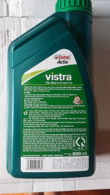 Dầu nhớt sastrol activ vistra 20w-50 đặc chế với công thức SIÊU CHỐNG NHIỆT -SUPER HEAT Gruard nhằm chống lại các tác động có hại của nhiệt độ cao bên trong động cơ xe máy 4 kỳ ,giúp xe vận hành êm ái bền bỉ trên mọi nẻo đườngĐộ nhớt:SAE 20W-50