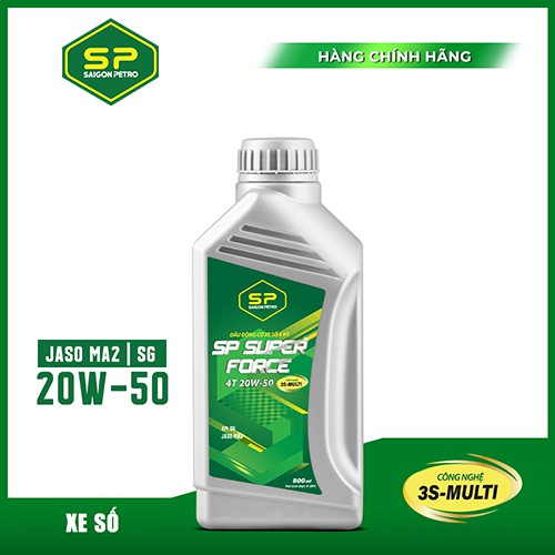 SP SUPER FORCE 4T SG 20W-50 chuyên dùng cho xe số 4 kỳ hiện đại, được chế tạo theo CÔNG NGHỆ 3S-MULTI đặc biệt ngăn chặn sự tiêu hao dầu, bảo vệ chống trượt ly hợp tối ưu, chống mài mòn vượt trội động cơ - hộp số - ly hợp giúp động cơ vận hành êm ái, làm sạch chủ động giúp loại bỏ hoàn toàn cặn bám và kéo dài thời gian bảo dưỡng gấp 2 lần so với các loại dầu động cơ thông thường.