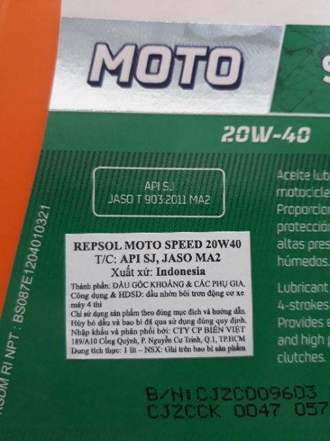 Dầu gốc khoáng nhập khẩu từ Repsol Indonesia,sản phẩm của tập đoàn Repsol chuyên sản xuất dầu nhớt cho đội đua Honda.API SJ,JASO MA2,SAE 20W-40Phù hợp với xe số và xe tay côn như Wave,Sirius,Future,Winner,Exciter,Raider,CBR,TFX,...