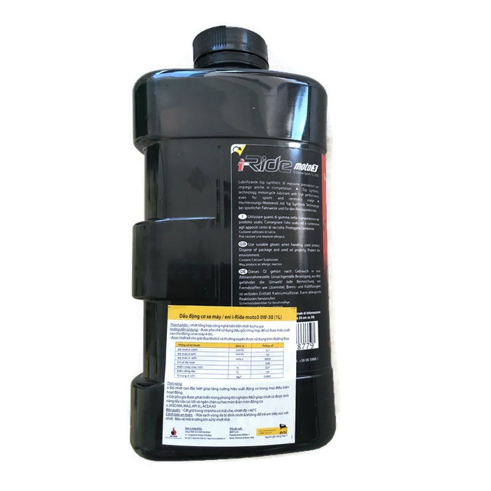 eni i-Ride moto3 0W-30 là nhớt tổng hợp công nghệ tiên tiến nhất được thiết kế cho giải đua Moto3 và thường xuyên được sử dụng trên đường đua.eni i-Ride moto3 0W-30 được pha chế sử dụng dầu gốc tổng hợp để có được hiệu suất cao cho động cơ xe máy 4-thì.