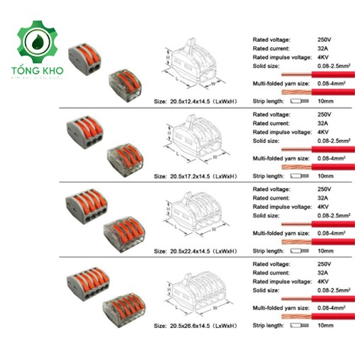 - Kích thước dây điện phù hợp : 0.5mm2 đến 4.0 mm2 dây cứng, dây mềm đa lõi từ 0.5 mm2 đến 2.5 mm2