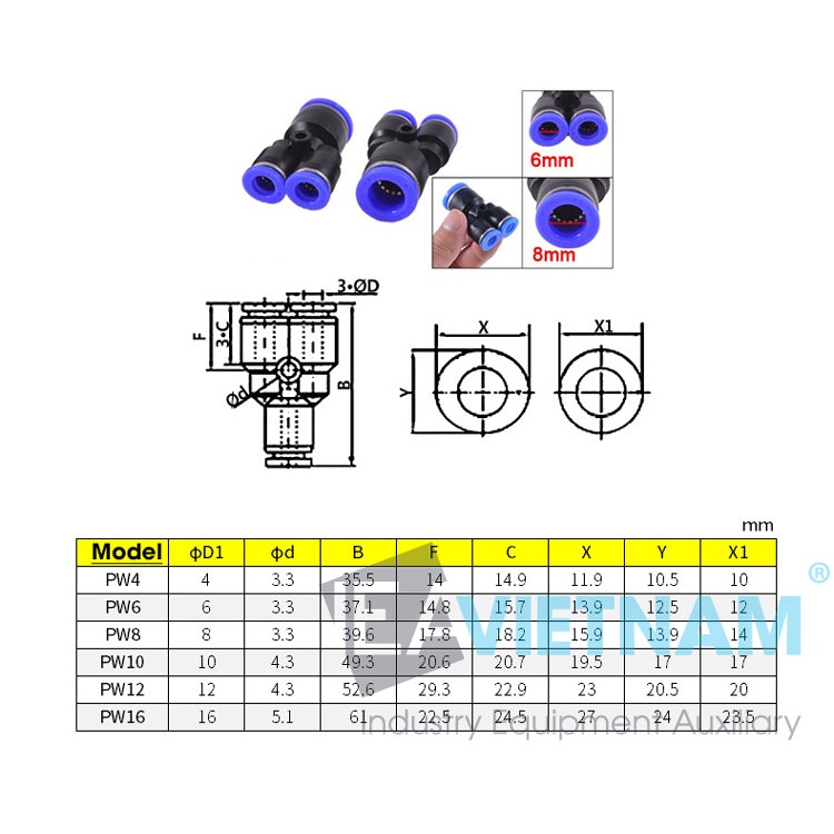 Giới thiệu Đầu nối nhanh PW chia 3 Y chuyển đổi PW8-4 PW8-6 PW6-4 PW10-6 PW10-8 PW12-8 PW12-10 PW16-12