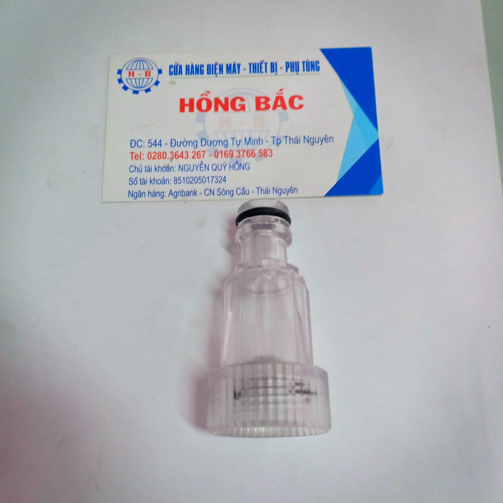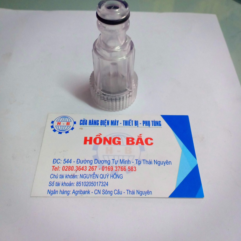 Đầu nối nhanh trắng + lọc rác máy rửa xe cao áp miniĐầu nối nhanh lắp vào đầu vào máy rửa xe áp lực cao mini được chế tạo bằng nhựa trong dầy cứng cáp, phần ren chế tạo chính xác cho phép tháo lắp dễ dàng. Sản phẩm có 02 doăng, một doăng ở phần lòng ren lắp vào đầu hút của máy rửa xe, một doăng lắp vào đầu nối nhanh của dây hút máy rửa xe, đảm bảo độ kín khít tránh tụt áp bơm. ngoài ra bên trong có thiết kế lọc rác ngăn chặn cặn bẩn lọt vào đầu bơm.