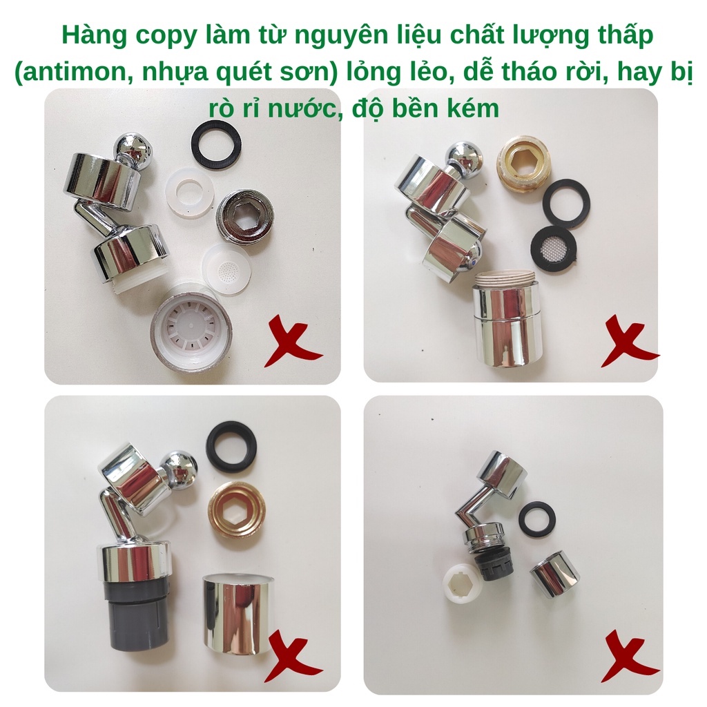 Lưu ý: Trên thị trường đã xuất hiện nhiều loại hàng gia công với chất lượng thấp, thường làm bằng antimon (có nhiễm chì, gây độc thứ cấp), thường được sơn màu bạc (không phải mạ crom 3 lớp) thiết kế lỏng lẻo, dễ gây rò rỉ nước, khó xoay, độ bền thấp, nhanh xuống màu. Các bạn xem ảnh mô tả để phân biệt nhé.