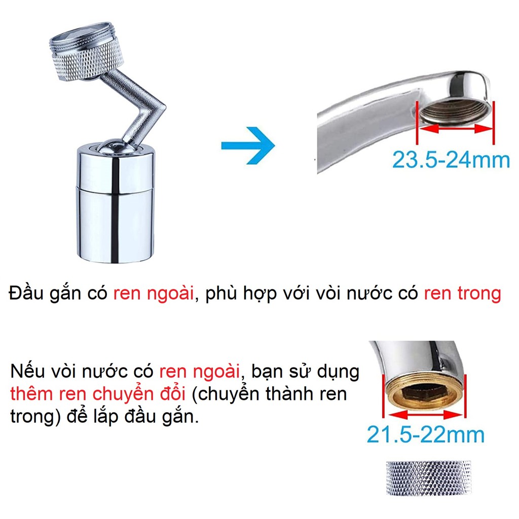 - Kiểu ren: ren theo tiêu chuẩn chung ngành nước - ren ngoài 24mm (M24), tặng kèm ren chuyển đổi bằng đồng thau (FM24-FM22), phù hợp hầu hết các loại vòi nước.