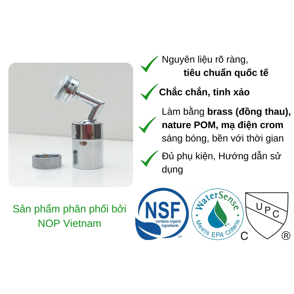 ✔️ AN TOÀN VỚI VẬT LIỆU CHẤT LƯỢNG CAO: Vỏ sản phẩm được làm bằng đồng thau nguyên chất, lõi được làm bằng Nature POM, đạt tiêu chuẩn NSF (Trung tâm hợp tác về an toàn thực phẩm và nước uống của Tổ chức y tế thế giới (WHO)), và 15 ACC NY 03 (Eurofins) không gây độc tố khi sử dụng, cả khi dùng với nước nóng;
