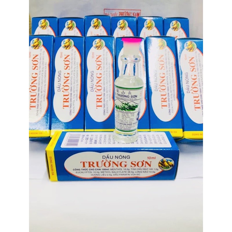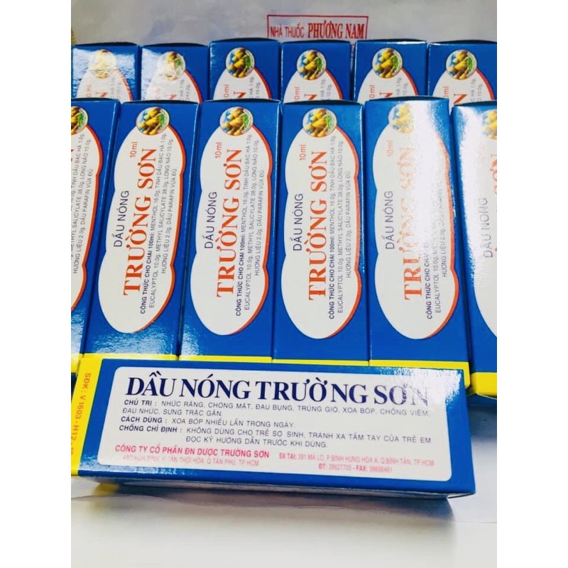 Dầu nóng Trường Sơn chủ trị cảm, ho, sổ mũi, trúng gió, nhức đầu, say tàu xe, xoa bóp chống viêm cảm, muỗi chích, kiến cắn, buồn nôn, đau bụng, nhức mỏi tay chân, đau khớp, trật gân.Thành phần: