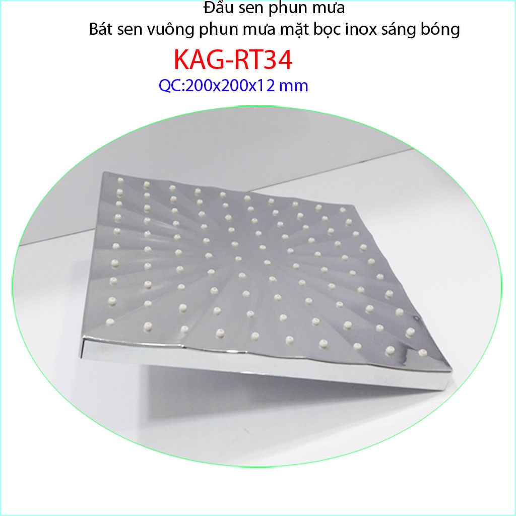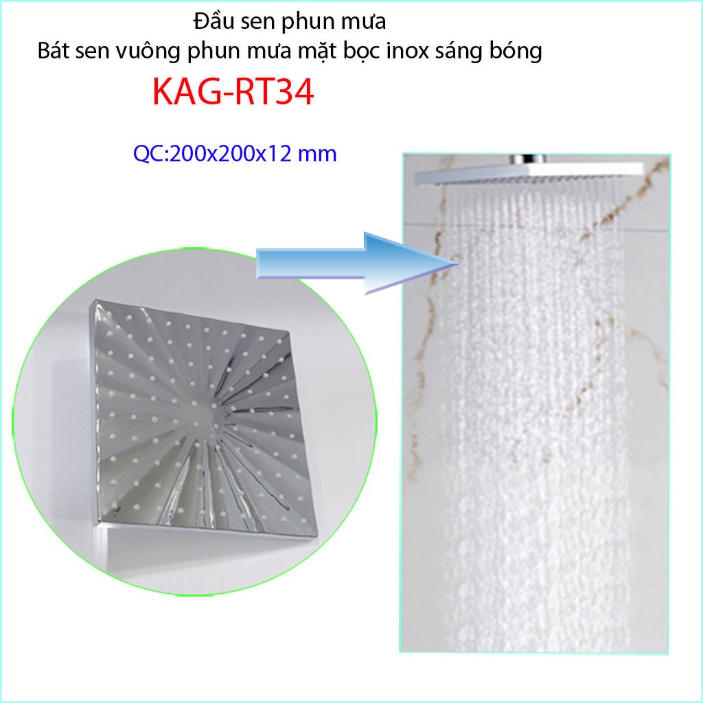 Đầu sen phun mưa, bát sen tắm phun mưa, bát sen tắm đứng KAG-RT34Chất liệu: Đầu sen phun mưa, bát sen tắm phun mưa KAG-RT34 được bọc xung quanh bởi inox sáng bóng, mặt phun mưa làm bằng cao su đàn hồi cao cấp dễ vệ sinh, tạo áp lực phun mưa mạnh hơn, mặt sen thiết kế 3D giống như kim cương tạo cảm giác tia nước phun mưa nhiều lớp . Thiết kế mới nhất 2018.