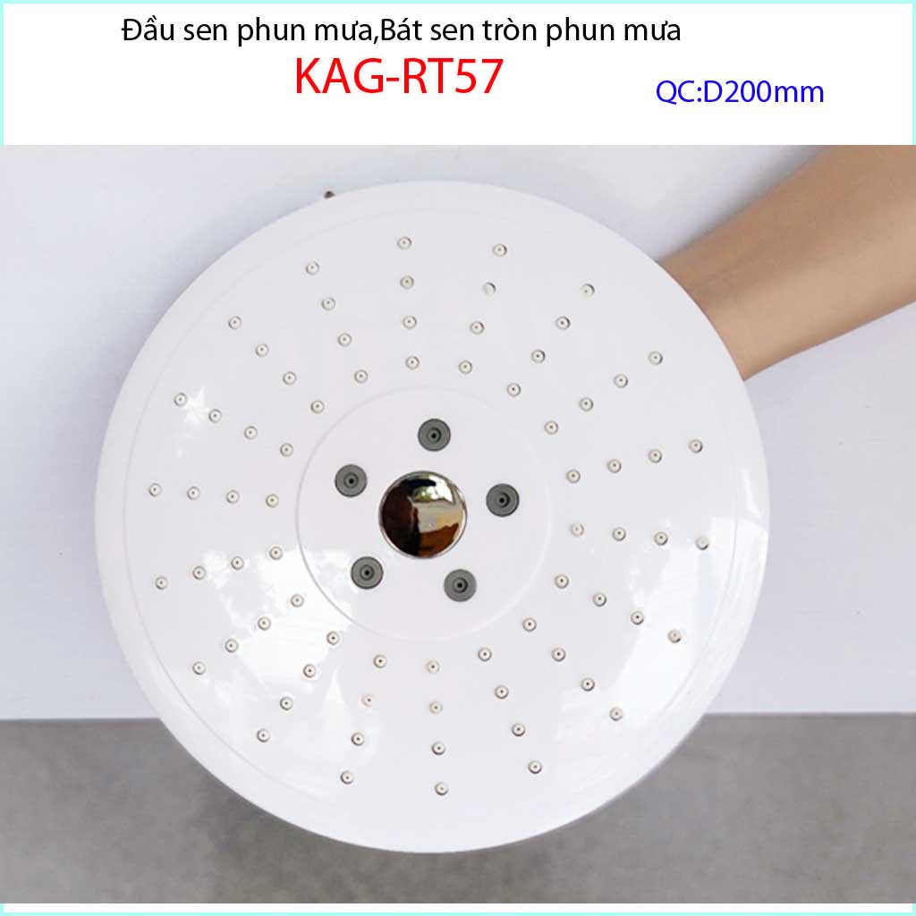 Đầu sen phun mưa, bát sen tắm phun mưa, bát sen tắm đứng KAG-RT57Đầu sen phun mưa, bát sen tắm phun mưa KAG-RT57 được sản xuất bởi nhựa ABS mạ chrome sáng bóng, mặt phun mưa làm bằng cao su đàn hồi cao cấp dễ vệ sinh, tạo áp lực phun mưa mạnh hơn