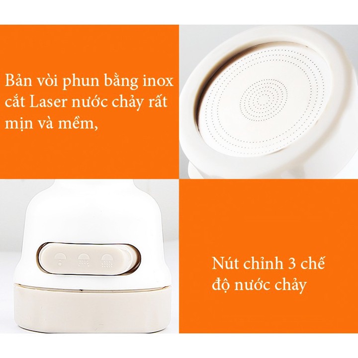 Đầu vòi tăng áp 3 chế độ phun - Điều hướng xoay 360 độChất liệu : Nhựa ABS, phụ kiện lắp đi theo - Vòi có thể sử dụng cho nguồn nước nóng