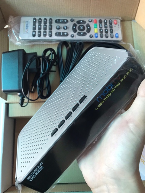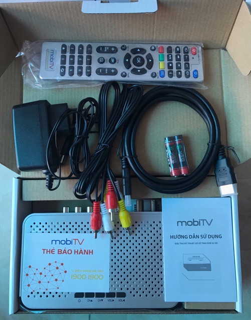 Phụ kiện bao gồm:1 đầu thu Mobi ,1 thẻ giải mã,1 nguồn 12v,1 điều khiển,1 dây hdmi,1 dây Av