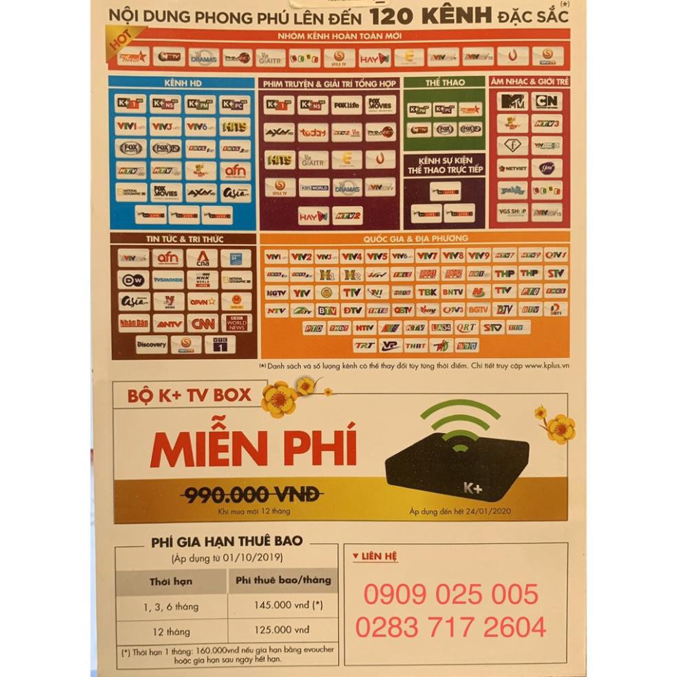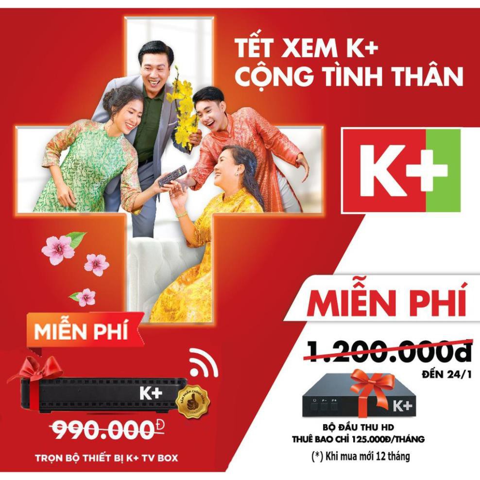 Đầu Tivibox K+ HD Kèm 12 thángLắp mới sẽ được tặng thiết bị luôn ạ .Áp dụng 04/01/2020 đến 24/01/2020 .Bộ K+ box ( internet) hay DTH ( chảo) . Khi đóng 12 tháng thuê bao 125.000 × 12 = 1.500.000 + 200.000 phí lắp đặt / 1 tivi /1 đầu thu ( bảo hành thiết bị 12 tháng không bao gồm remote + dây hdmi) .Tín hiệu chảo thu bảo hành 6 tháng . Tổng cộng 1.700.000 ( thiết bị được tặng nha cả nhà )