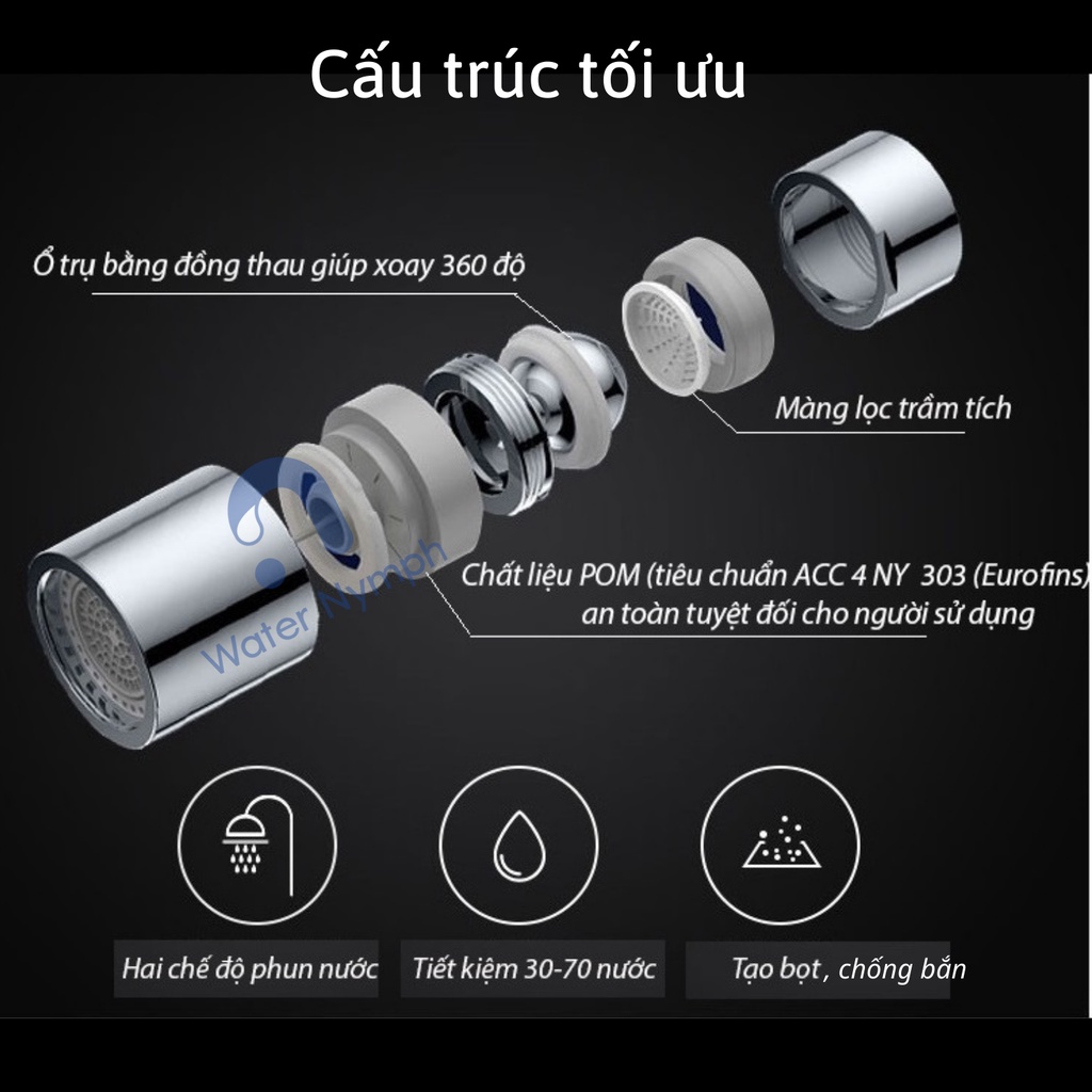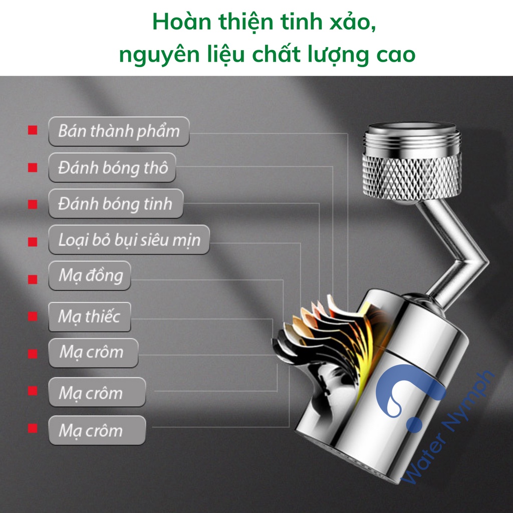 ( Vui lòng xem video để phân biệt sản phẩm phân phối bởi NOP Vietnam và hàng gia công/copy chất lượng thấp)Đầu vòi nước xoay 360 - 720 độ, hai chế độ phun nước tiện ích Waternymph là sản phẩm cao cấp, sáng tạo của Waternymph, đạt 47 giải thưởng sáng tạo quốc tế, dùng cho vòi nước bồn rửa mặt, rửa bát:
