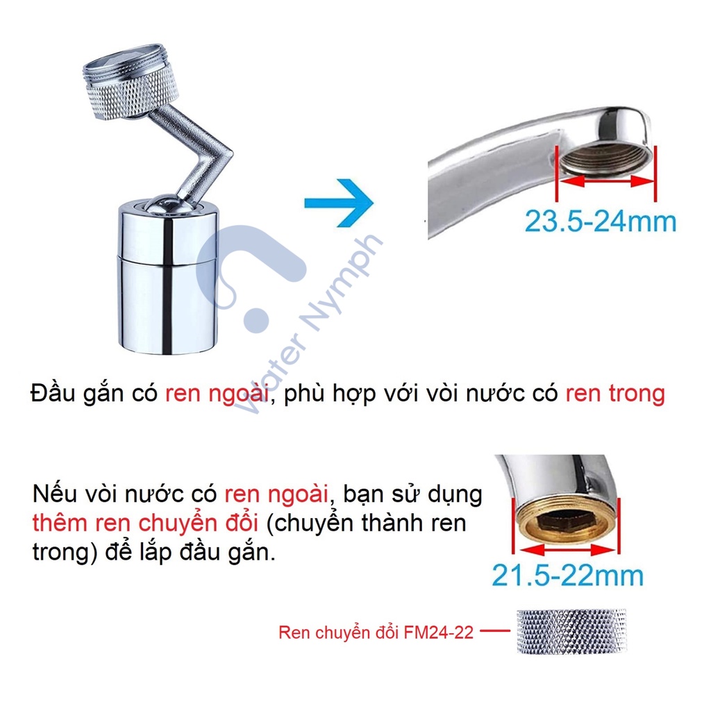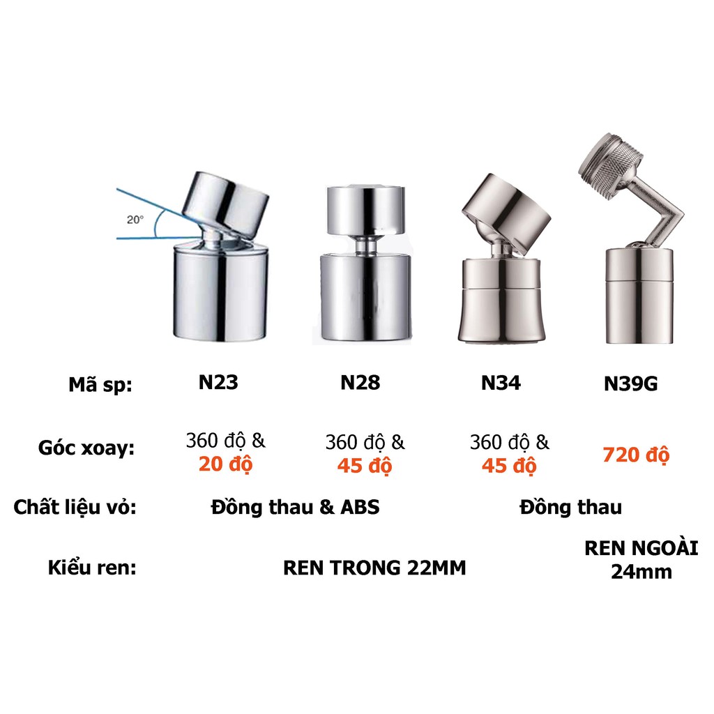 + N22, N23, N28, N34: xoay 360 độ; có kiểu ren trong phi 22mm; tặng kèm bộ ren chất liệu POM 5 món cho vòi nước ren trong, ngoài: phi 20, 22, 24mm và ren G1/2.