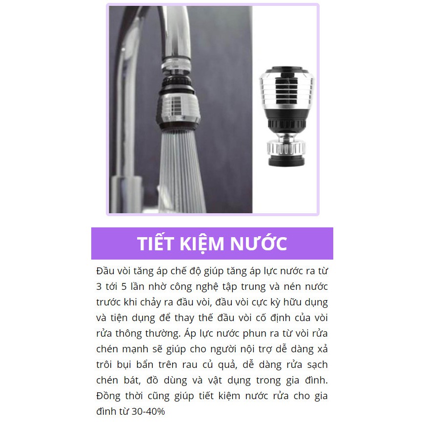 -Đầu vòi tăng áp chế độ giúp tăng áp lực nước ra từ 3 tới 5 lần nhờ công nghệ tập trung và nén nước trước khi chảy ra đầu vòi, đầu vòi cực kỳ hữu dụng và tiện dụng để thay thế đầu vòi cố định của vòi rửa thông thường. Áp lực nước phun ra từ vòi rửa chén mạnh sẽ giúp cho người nội trợ dễ dàng xả trôi bụi bẩn trên rau củ quả, dễ dàng rửa sạch chén bát, đồ dùng và vật dụng trong gia đình. Đồng thời cũng giúp tiết kiệm nước rửa cho gia đình từ 30-40%