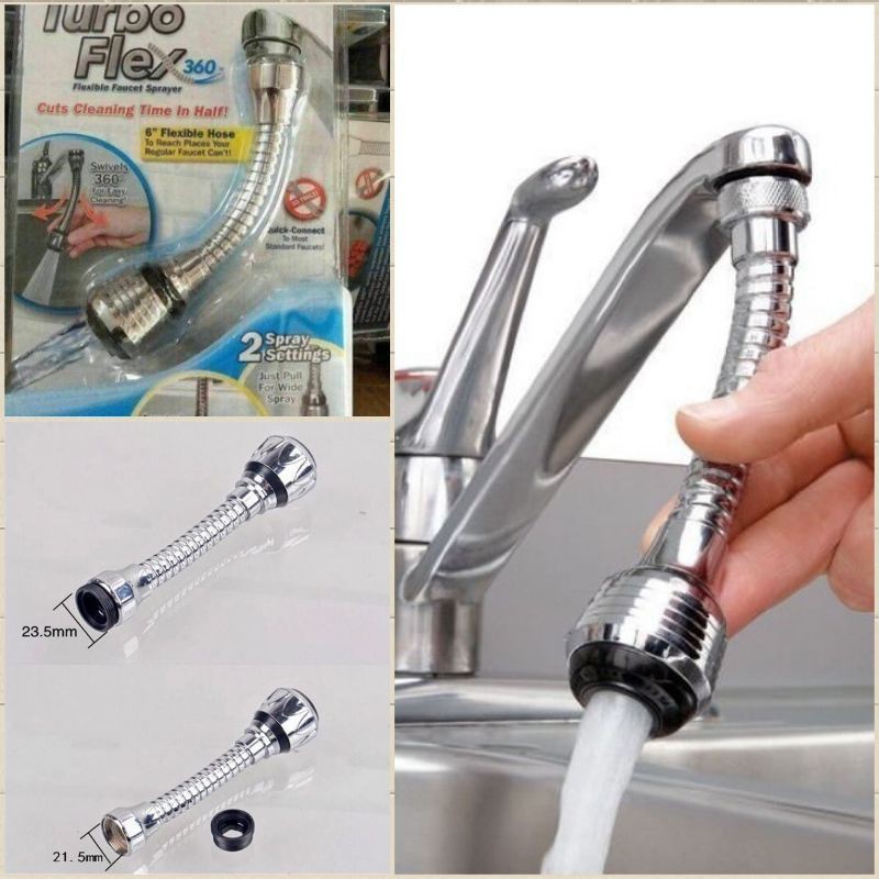 Đầu Vòi Xịt Nước Tăng Áp Turbo Flex 360Đầu Vòi Xịt Nước Tăng Áp Turbo Flex 360 thiết kế dạng vòi sen dùng để điều chỉnh dòng nước ở bồn rửa giúp bạn rửa chén bán, rau củ, thực phẩm… tiện lợi dễ dàng hơn. Chất liệu inox không gỉ, và với cấu trúc có thể uốn dẻo thông minh, chiếc vòi này thật sự đem đến cho người sử dụng dễ dàng biến vòi nước thông thường trở thành linh hoạt với nhiều hướng, ngoài ra vòi được thiết kế với 2 chế độ xả nước cho bạn lựa chọn đó là 1 chế độ phun với áp lực và 1 chế độ phun góc rộng.