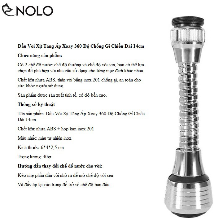 Đầu Vòi Xịt Tăng Áp Xoay 360 Độ Chống Gỉ Chiều Dài 14cmChức năng sản phẩm: